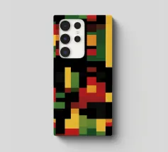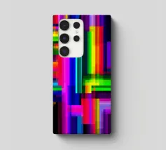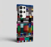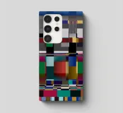 An abstract composition features a series of geometric shapes and bold, vibrant colors arranged in a grid pattern. Distinctive blocks of color are interspersed with linear elements, creating a visually dynamic and modern design.