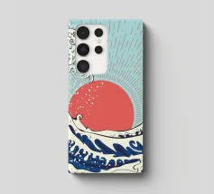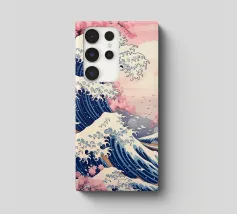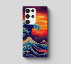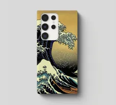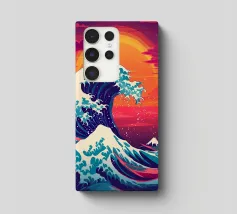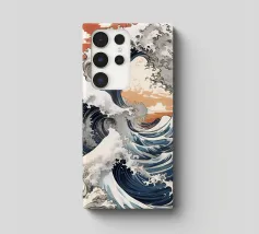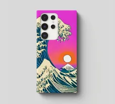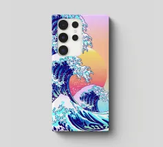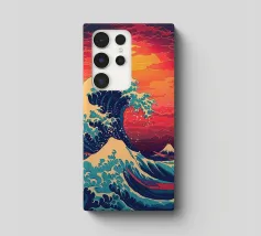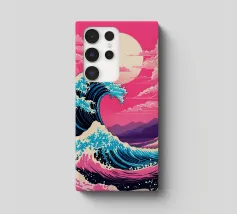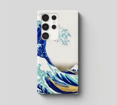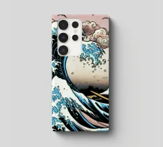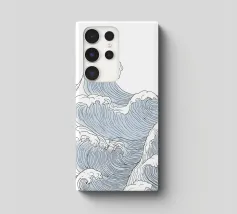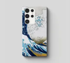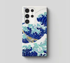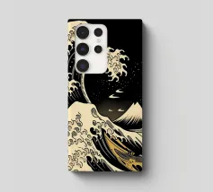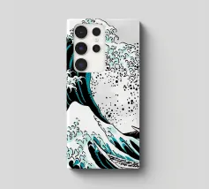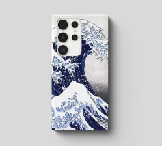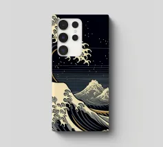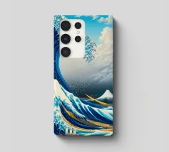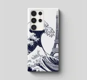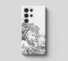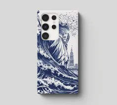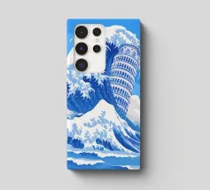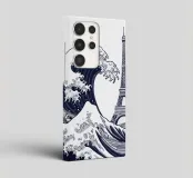 L'immagine raffigura un'illustrazione stilizzata in bianco e nero della Grande Onda al largo di Kanagawa, una famosa xilografia giapponese, con la Torre Eiffel sovrapposta all'onda. L'onda è raffigurata in un movimento dinamico e vorticoso, con creste spumeggianti e una base blu intenso. La Torre Eiffel si erge alta e slanciata, con la sua struttura intricata che contrasta con la forma organica dell'onda.
