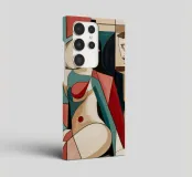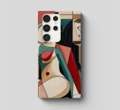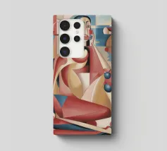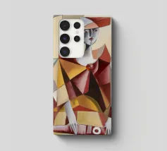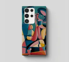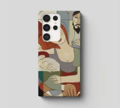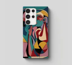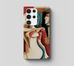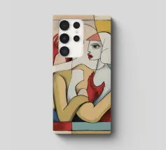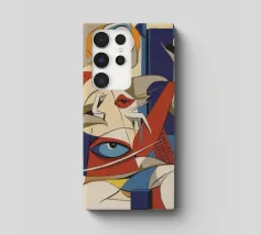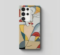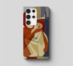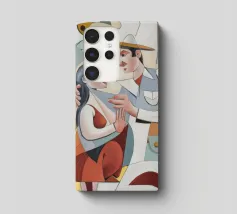 Questo dipinto presenta due figure astratte in una posa intima e ravvicinata. L'uso di forme geometriche e di colori decisi aggiunge profondità e complessità alla scena.