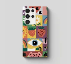 A cheerful and colorful pattern composed of a grid of squares, each filled with different playful, geometric, and organic designs. The artwork has the warm, joyful feel of a modern, handcrafted quilt.