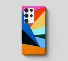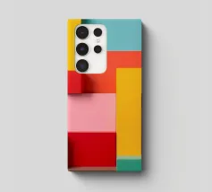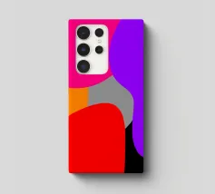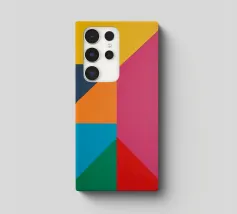 Vibranti forme geometriche in viola, rosso, giallo e blu si sovrappongono su un audace sfondo giallo e scuro, mostrando un'arte astratta dal tocco moderno.