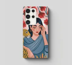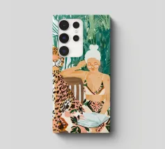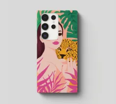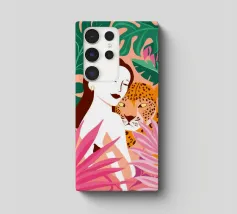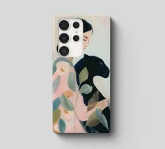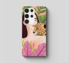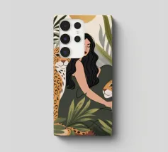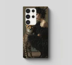 Questa opera d'arte ritrae una persona in abito nero che assume una posa composta accanto a un leopardo. La scena emana raffinatezza, sicurezza e arte senza tempo.