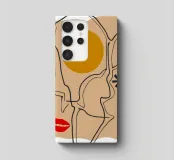 A continuous line drawing creates an abstract face with red lips and a star, overlapping with a sun shape on a textured background, blending minimalism and surrealism.
