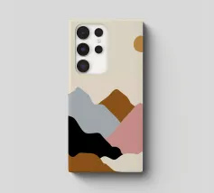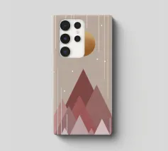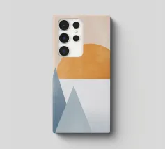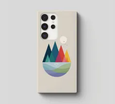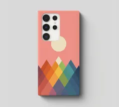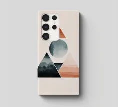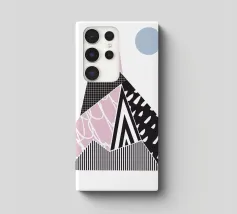 Le forme geometriche formano un paesaggio montano minimalista, con un cerchio in alto che ricorda il sole. Sotto è raffigurato un riflesso invertito delle cime, che crea un disegno simmetrico.