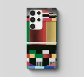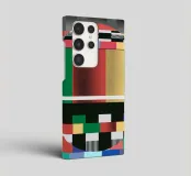 Una composizione di motivi geometrici presenta un cerchio con audaci strisce verticali rosse, gialle e verdi, intersecato da barre orizzontali e circondato da una varietร  di rettangoli a scacchi e a tinta unita. Un mix di colori vivaci e tenui, insieme a linee nette, sono i motivi che caratterizzano la composizione.