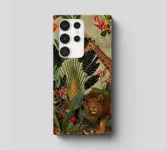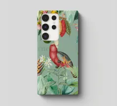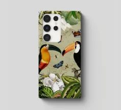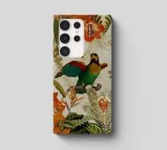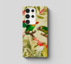Un vivace collage di illustrazioni vintage con bellissimi e colorati pappagalli verdi appollaiati in mezzo a un lussureggiante paesaggio floreale. La scena è ricca di fascino tropicale ed esotico, poiché i pappagalli si stagliano sullo sfondo del fogliame vibrante della giungla. Intorno a loro sbocciano incredibili fiori esotici, mentre i rami di palma aggiungono un tocco di eleganza tropicale. Sullo sfondo, una mappa d'epoca emerge dolcemente, aggiungendo un senso di avventura e di viaggio. Questa miscela armoniosa di natura, fauna selvatica e fascino vintage crea un disegno senza tempo, perfetto per gli amanti dei paesaggi esotici e dell'arte nostalgica.