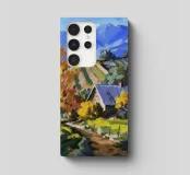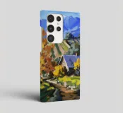 Un pittoresco paesaggio autunnale che raffigura un villaggio o una fattoria adagiata su una collina, circondata da un mosaico di alberi colorati nei toni dell'arancione e del giallo e da campi coltivati, con le lontane montagne blu a completare la scena.