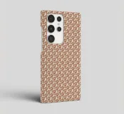A repetitive geometric pattern composed of white shapes is set against a brown background, creating a uniform and rhythmic design. The arrangement of shapes forms a continuous and seamless visual effect.