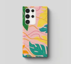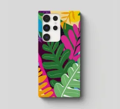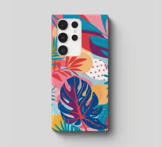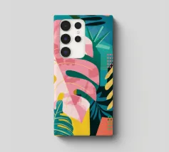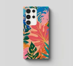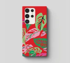 A modern, graphic pattern of large red and pink tropical leaves against a vibrant pink background. The composition is a bold, stylish, and beautiful piece of contemporary botanical design.