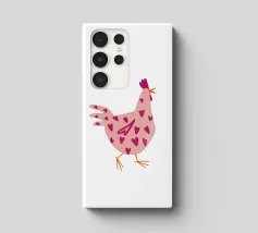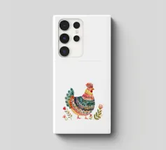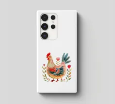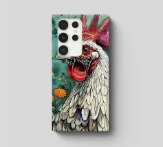 Un disegno a fineliner e pennarello ad acquerello di una gallina. È bianca, nera e rossa.