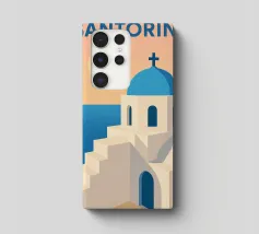 Questo poster vintage di Santorini illustra il fascino unico dell'isola greca con le sue case bianche, la cupola blu e le bouganville in fiore sul bordo del Mar Egeo. Un poster mediterraneo luminoso che invita al viaggio e al relax.