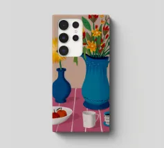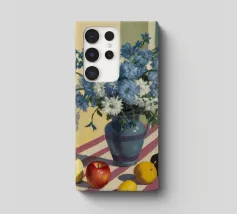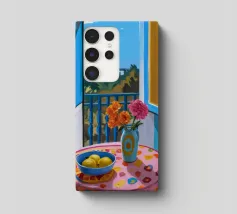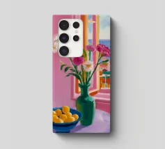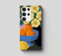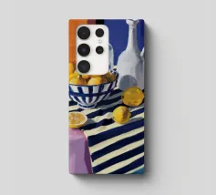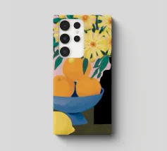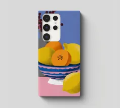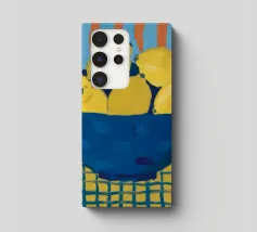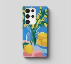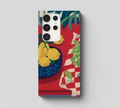 Un'invitante natura morta su un tavolo rosso brillante, con una ciotola di limoni e un vaso blu che contiene delicati fiori bianchi. Lo sfondo giallo caldo esalta l'atmosfera accogliente e vivace.