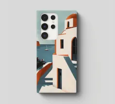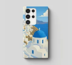 Una rappresentazione minimalista dell'iconica architettura imbiancata di Santorini, in Grecia, sotto un cielo calmo e crepuscolare, che trasmette un profondo senso di pace, tranquillità e bellezza senza tempo.