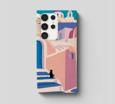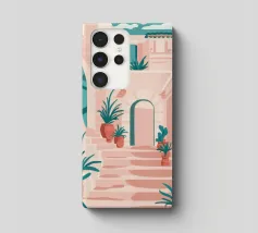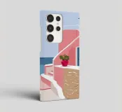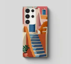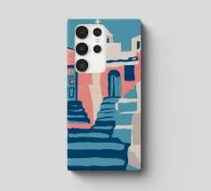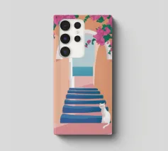 Una classica scena mediterranea che raffigura un edificio rosa con una scala che scende verso un tranquillo mare blu. Quest'opera d'arte cattura perfettamente il fascino solare e pacifico di un'isola greca.