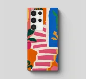 Un'illustrazione astratta mostra una scala colorata adornata da una varietà di piante in vaso, fondendo architettura e botanica in una composizione vivace e moderna.