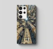 Una surreale visione fisheye di strutture urbane torreggianti con dettagli intricati e modelli simmetrici, che convergono verso un cielo radioso. Il design architettonico stratificato evidenzia l'innovazione moderna e la creatività artistica.
