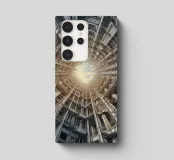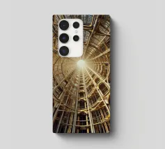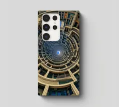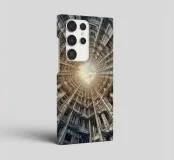 Un design architettonico intricato che forma una struttura a tunnel con simmetria a raggiera, che converge verso una luce incandescente al centro. La prospettiva crea profondità e un'estetica ipnotica e futuristica.