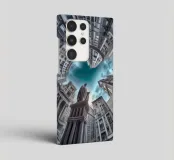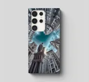Questa immagine raffigura un'impressionante disposizione architettonica circolare con alti edifici classici modernizzati che convergono verso il cielo. Una statua prominente al centro esalta la prospettiva drammatica sotto un cielo azzurro e nuvoloso.