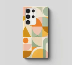An abstract artwork of geometric shapes in earthy green, orange, and beige tones, arranged with balance on a textured light background.