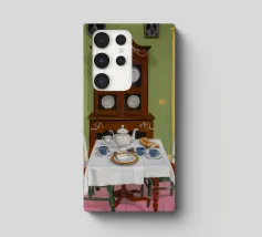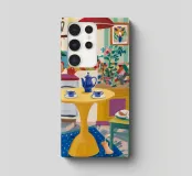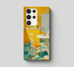 A vibrant patchwork kitchen with yellow table, tea set, and art bursts with domestic color.