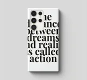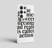 "Le parole 'La distanza tra i sogni e la realtà si chiama azione' sono disposte in un layout tipografico di grande impatto visivo, che sottolinea il potere di agire per raggiungere gli obiettivi. Il testo è audace e d'impatto, su uno sfondo pulito e minimalista, che crea un senso di motivazione e determinazione",