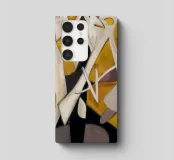 Dynamic abstract forms in white and yellow clash and embrace in a jagged, rhythmic choreography.