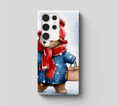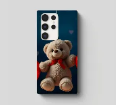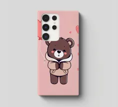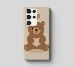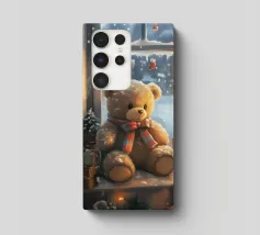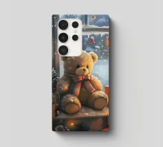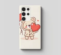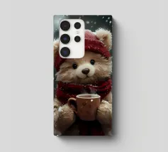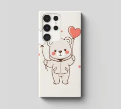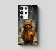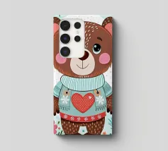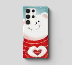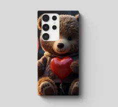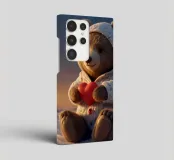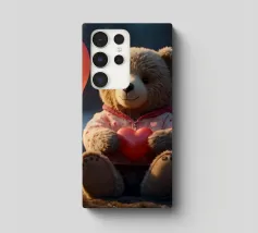 Un simpatico orsacchiotto vestito con un'accogliente felpa con cappuccio siede nella neve, tenendo gioiosamente un cuore rosso mentre un palloncino si muove nell'aria fresca della sera sotto un tramonto colorato.