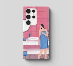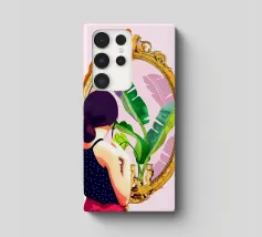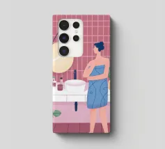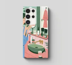 This artwork shows a person with blonde hair looking into a vanity mirror. The background is filled with floral wallpaper, and the vanity table is adorned with various items, creating a nostalgic and intimate scene.