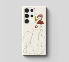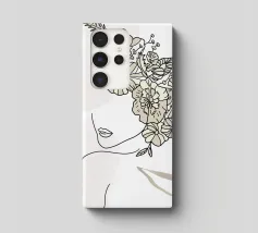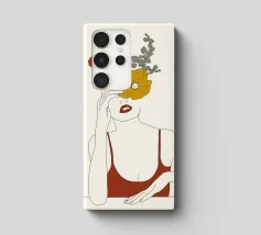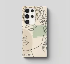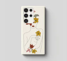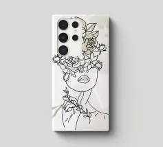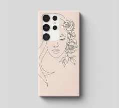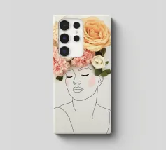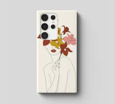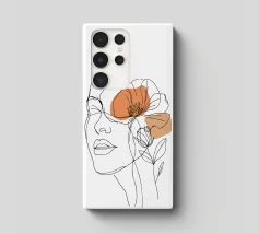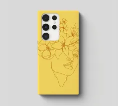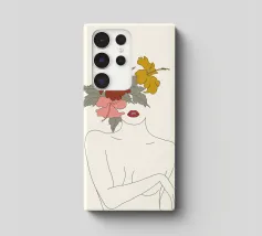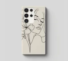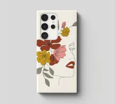 Un disegno al tratto minimalista raffigura il profilo di una donna dall'espressione serena. I suoi capelli sono ornati da grandi fiori stilizzati di colore arancione e giallo e da foglie delicate.