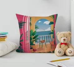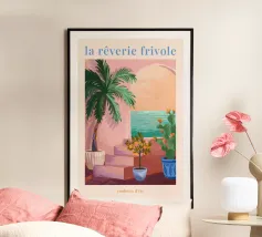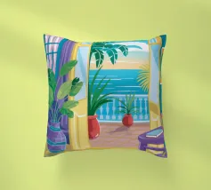 Un'illustrazione tropicale in un ambiente mediterraneo. La panchina invita a sognare in questo ambiente estivo.