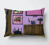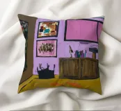 L'ambiente interno è caratterizzato da pareti rosa caldo, un mobile in legno che espone oggetti decorativi, una parete di galleria eclettica e una vista su una stanza adiacente.