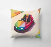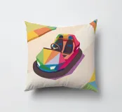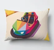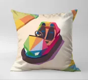 Illustrazione di un autoscontro colorato in un'arena di gioco con uno stile geometrico moderno.