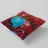 Un vaso blu turchese brillante racchiude un rigoglioso bouquet di fiori viola, rosa e rossi, disposti in modo drammatico su una superficie zebrata su uno sfondo rosso intenso.