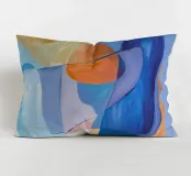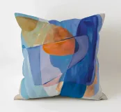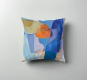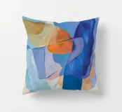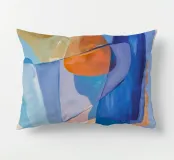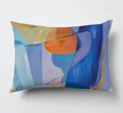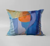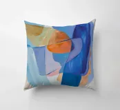 Un dipinto astratto dinamico, caratterizzato da forme fluide e sovrapposte in una suggestiva combinazione di blu, arancione caldo e beige neutro, che trasmette un'energia fluida.