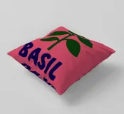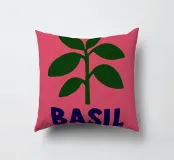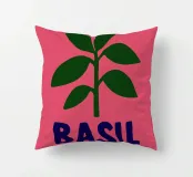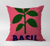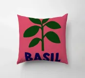 Un poster moderno di ispirazione pop art con il basilico come motivo grafico principale. Le foglie stilizzate di colore verde intenso spiccano sullo sfondo rosa acceso, completate dalla scritta "BASIL" in blu scuro. Questo design minimalista in stile Artezza gioca con i contrasti e i colori ed è perfetto come poster per la cucina, come decorazione per le piante o come elegante dichiarazione di erbe aromatiche per la vostra casa.