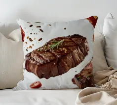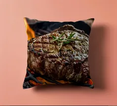 Una bella bistecca alla griglia è adagiata su un piatto bianco, ornato dai segni della griglia. La calda luce del sole mette in risalto i suoi colori ricchi, creando un'atmosfera invitante perfetta per il pranzo.