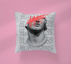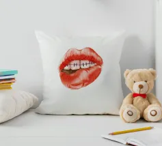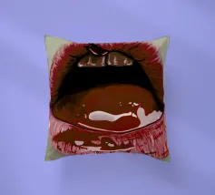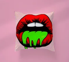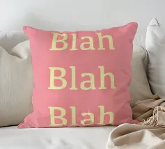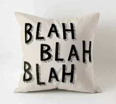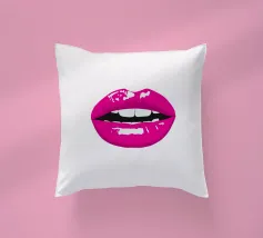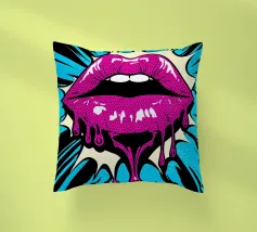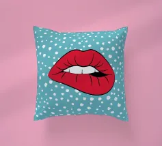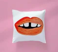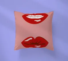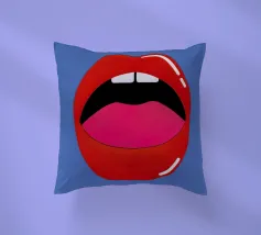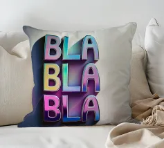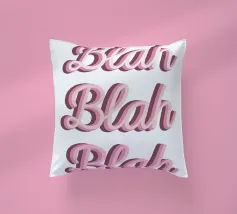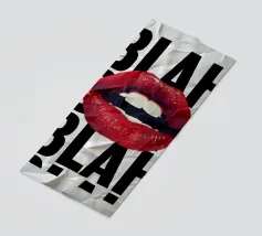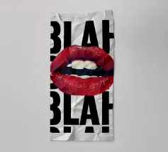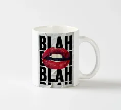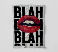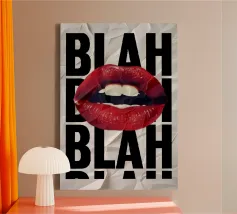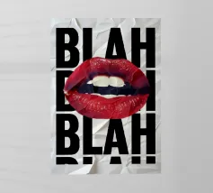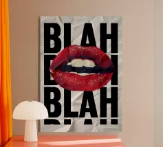 "Un paio di labbra rosse, lucide e vibranti, posizionate tra le parole 'BLAH' impilate verticalmente in una tipografia nera e audace su uno sfondo bianco e pulito, creano una dichiarazione giocosa e sprezzante. Il contrasto tra le labbra realistiche e il testo grafico aggiunge un tocco pop art.",