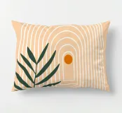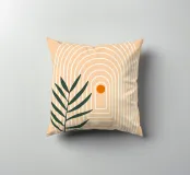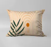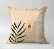 Un poster minimalista e moderno che combina forme naturali organiche con una geometria chiara. Al centro, una serie di archi rotondi bianchi e intrecciati che si estendono in profondità come un tunnel e conferiscono al disegno un forte effetto spaziale. Al centro si illumina un piccolo cerchio arancione, simbolo del sole, dell'energia o dell'equilibrio interiore. In primo piano, una foglia verde scuro con rami sottili contrasta con il rigore geometrico degli archi. Questo gioco di natura e struttura crea un equilibrio armonioso tra calma e dinamismo.