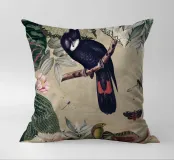 Questo accattivante collage vintage presenta un sorprendente cacatua nero appollaiato tra il lussureggiante fogliame tropicale. Le sue piume scure si stagliano con forza contro il verde vibrante e le piante colorate, creando un punto focale drammatico. Accartocciato nelle vicinanze, un elegante serpente si snoda tra le foglie e la sua forma sinuosa aggiunge un elemento di intrigo e pericolo alla scena. Le ricche trame del fogliame e il sorprendente contrasto tra il cacatua e il serpente evocano un senso di mistero e bellezza selvaggia, fondendo il fascino esotico dei tropici con un'atmosfera vintage e senza tempo.