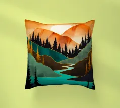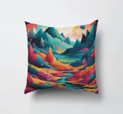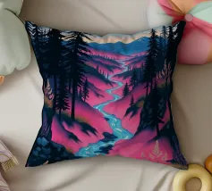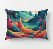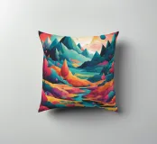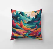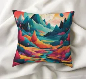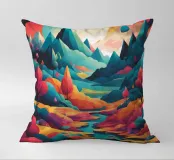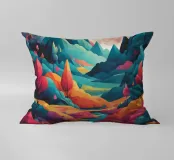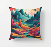 Si apre un paesaggio ipnotico, dove cime imponenti trafiggono un cielo pieno di sfere di luce. La scena è un tripudio di colori, con sfumature di arancio, rosa, blu e viola che si fondono senza soluzione di continuità. L'uso di linee spigolose e taglienti accostate a forme morbide e arrotondate crea una tensione visiva accattivante. Un fiume tranquillo si snoda nella valle, riflettendo i colori vibranti che la sovrastano. Quest'opera invita lo spettatore a esplorare un mondo in cui colore e forma danzano in perfetta armonia.