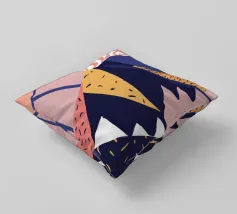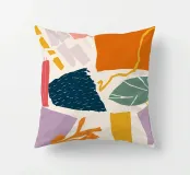 Un collage astratto di forme frantumate e sovrapposte in una vibrante tavolozza di arancione, blu e rosa crea una composizione dinamica, energica e moderna.