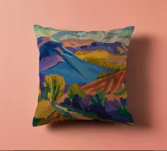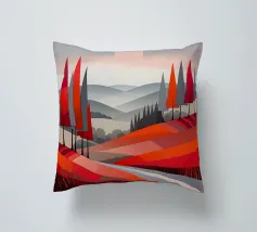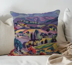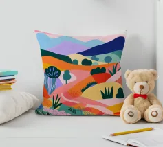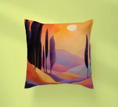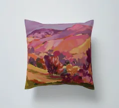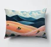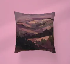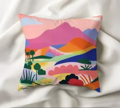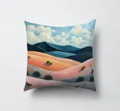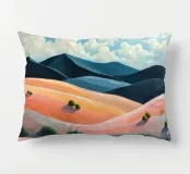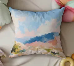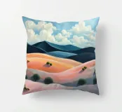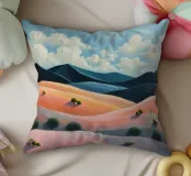 Morbide colline ondulate mostrano ricche sfumature di rosa, arancione e blu, mentre un cielo vibrante pieno di soffici nuvole esalta l'atmosfera tranquilla. Piccoli alberi punteggiano il paesaggio.