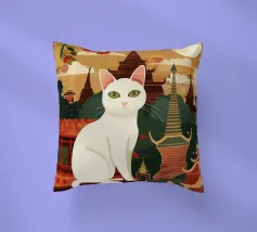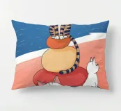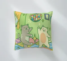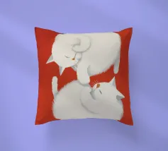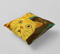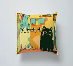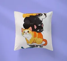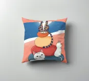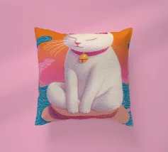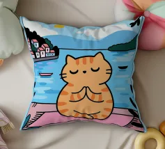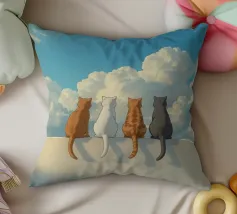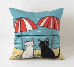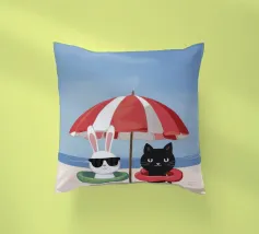 Un'ambientazione serena sulla spiaggia presenta un gatto seduto su cuscini impilati insieme ad altri due gatti, tutti intenti a guardare il tramonto. Le tonalità tenui e l'atmosfera pacifica evocano tranquillità e unione.