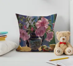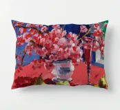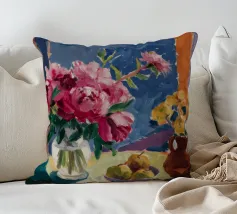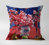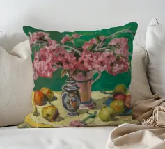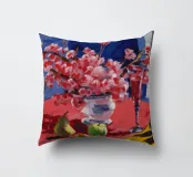 Un'audace natura morta con vivaci fiori rosso-rosa, forse papaveri o gerani, in un semplice vaso, accanto a fresche pere verdi, il tutto su una ricca tovaglia rossa che contrasta nettamente con uno sfondo blu intenso.