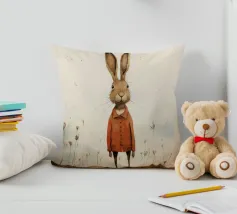 Un coniglio stravagante in plaid si muove con decisione, stringendo una lettera con urgenza surreale.