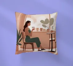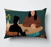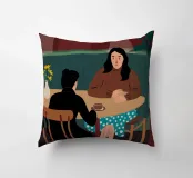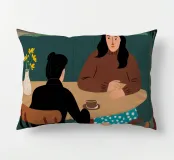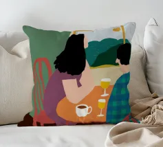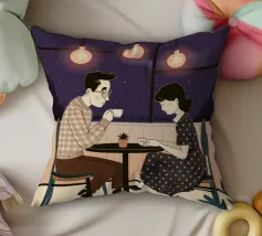 Un'illustrazione intima che cattura un momento di tranquillità tra due persone sedute a un tavolino di un bar. L'illuminazione calda e tenue e la loro interazione concentrata creano un racconto di conversazione e connessione, rappresentativo della vita sociale moderna.