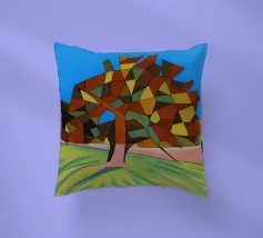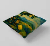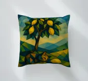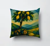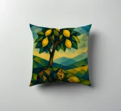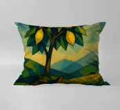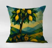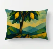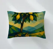 Un paesaggio geometrico cubista con un vivace albero di limoni in cima a dolci colline. In lontananza, un piccolo gatto riposa pacificamente, aggiungendo un tocco stravagante a questa composizione audace e colorata.