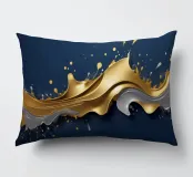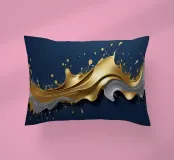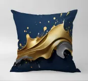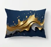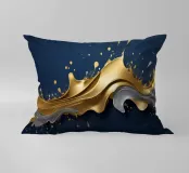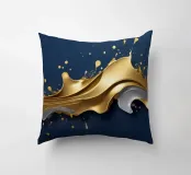 Una composizione astratta che mostra onde dinamiche di oro e argento, intrecciate con spruzzi vibranti su uno sfondo blu profondo, ideale per sfondi desktop e sfondi artistici.