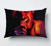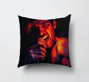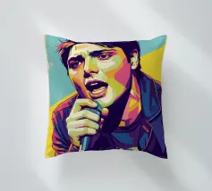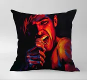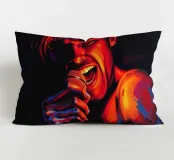 Una rappresentazione dinamica e colorata di un cantante maschile che canta appassionatamente in un microfono. L'intensa illuminazione del palco mette in risalto i suoi tratti espressivi e il suo fisico muscoloso.
