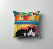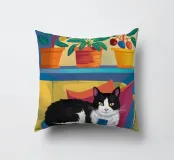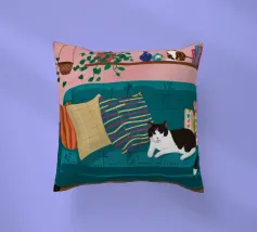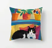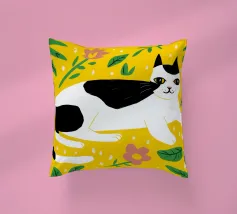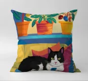 Un'illustrazione affascinante e accogliente di un gatto "smoking" bianco e nero che dorme pacificamente su un divano giallo, circondato da piante in vaso. L'opera d'arte cattura la gioia semplice e tranquilla di un pisolino.